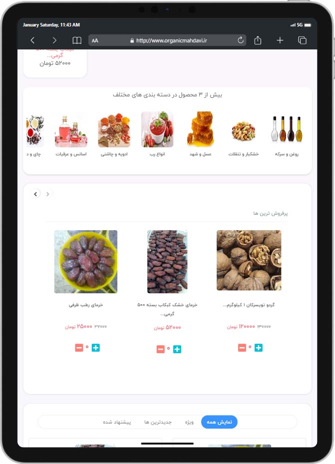 سایت مواد خوراکی ارگانیک مهدوی یک نمونه سایت فروشگاهی است. در زیر چند نمونه از صفحات این وبسایت قابل مشاهده است: